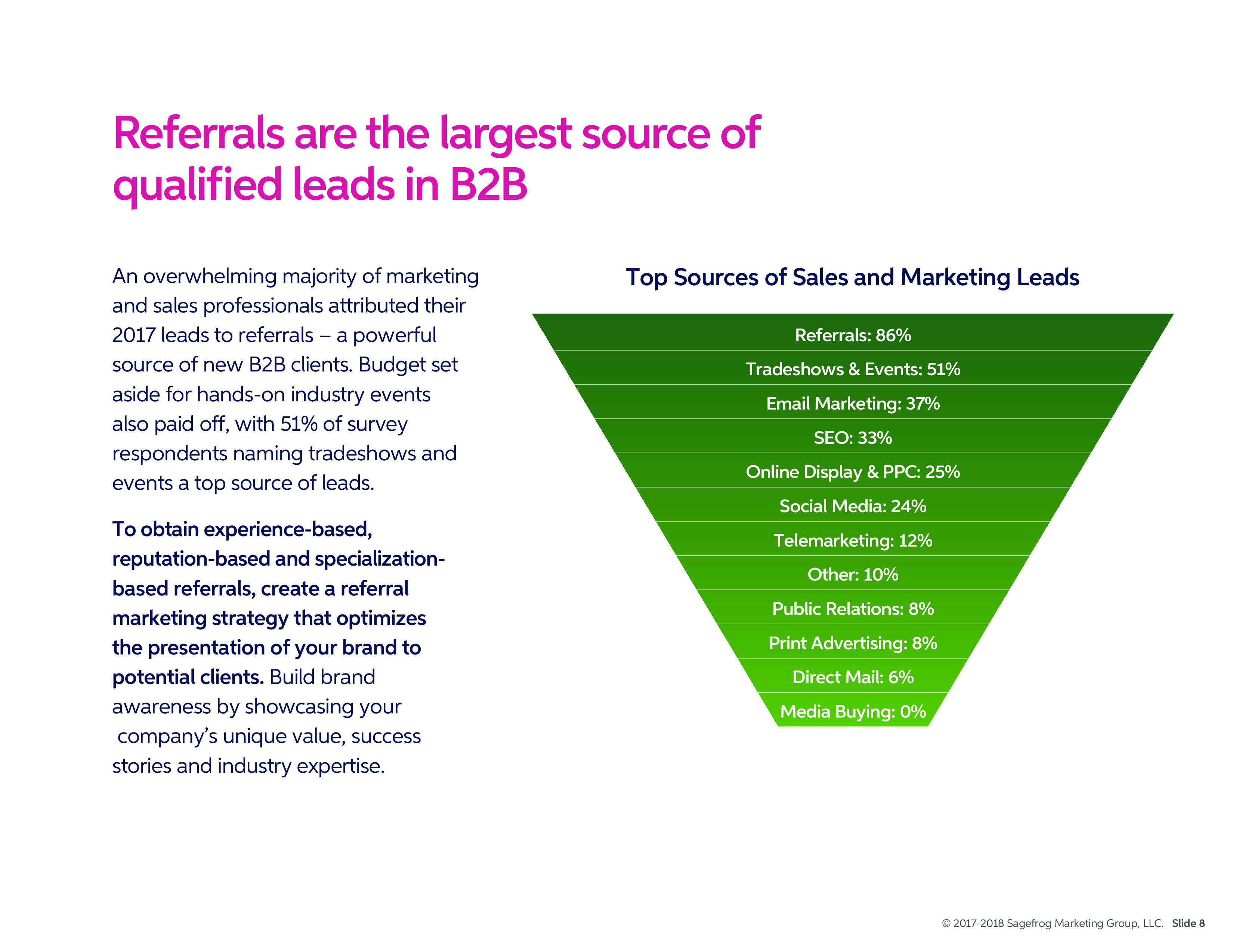 絕大多數(shù)受訪(fǎng)者將2017年產(chǎn)生的潛在客戶(hù)歸因于推薦,還有51%的受訪(fǎng)者認(rèn)為貿(mào)易展和活動(dòng)也推動(dòng)了潛在客戶(hù)的產(chǎn)生。