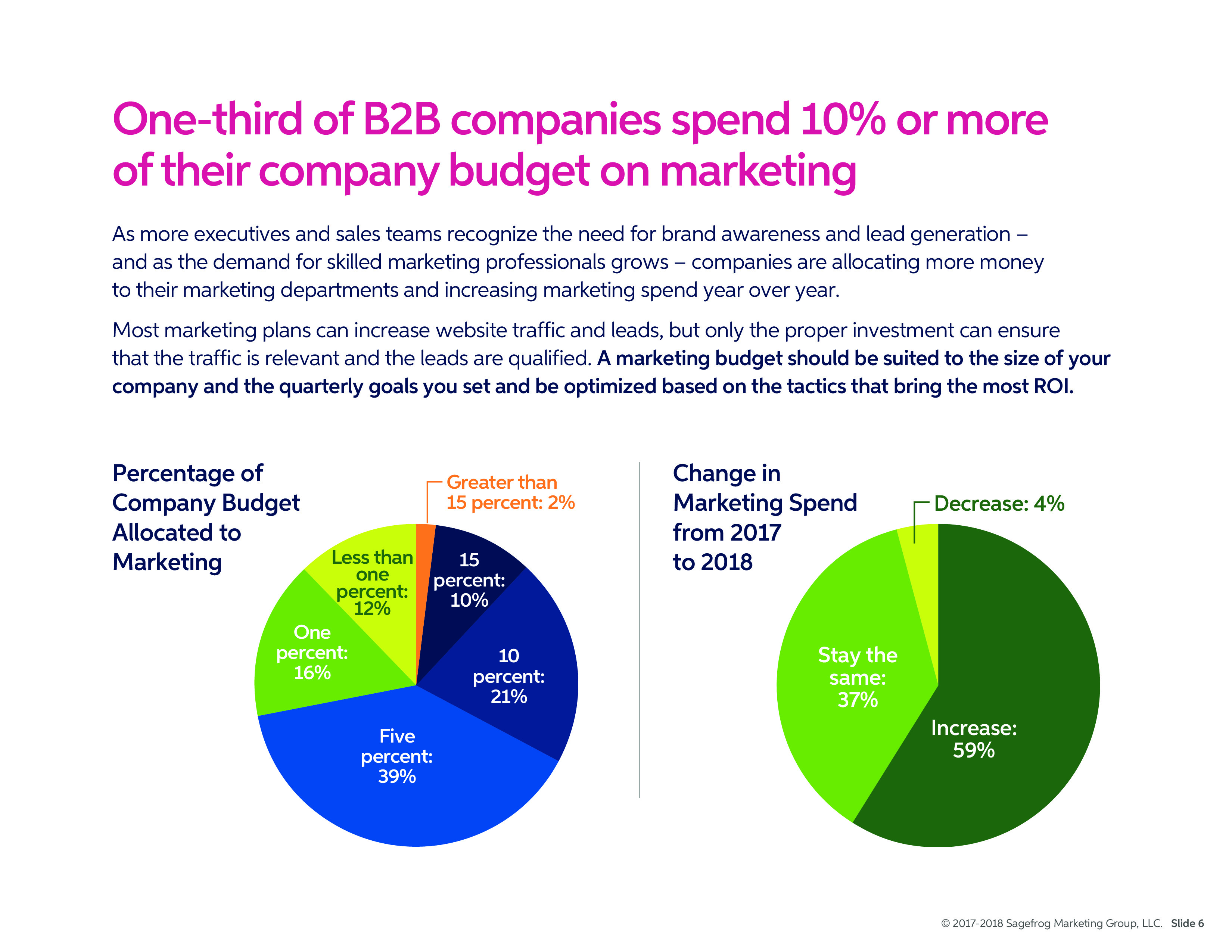 隨著越來(lái)越多的高管和銷(xiāo)售團(tuán)隊(duì)認(rèn)識(shí)到品牌意識(shí)和潛在客戶(hù)的需求,公司正在給營(yíng)銷(xiāo)部門(mén)分配更多的預(yù)算,營(yíng)銷(xiāo)預(yù)算逐年增長(zhǎng)。但是,營(yíng)銷(xiāo)預(yù)算應(yīng)該適合公司的規(guī)模和季度目標(biāo),并根據(jù)帶來(lái)最高投資回報(bào)的策略進(jìn)行優(yōu)化。
