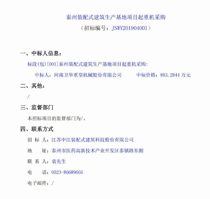 泰州裝配式建筑生產(chǎn)基地項(xiàng)目起重機(jī)采購中標(biāo)公告