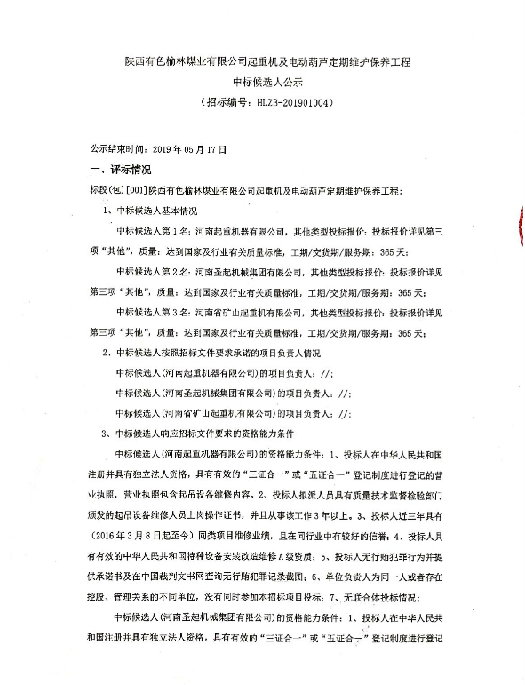 移動版:陜西有色榆林煤業(yè)有限公司起重機及電動葫蘆定期維護保養(yǎng)工程 中標候選人公示
