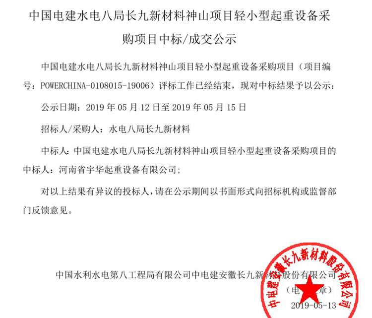 中國電建水電八局長九新材料神山項目輕小型起重設(shè)備采購項目成交公示