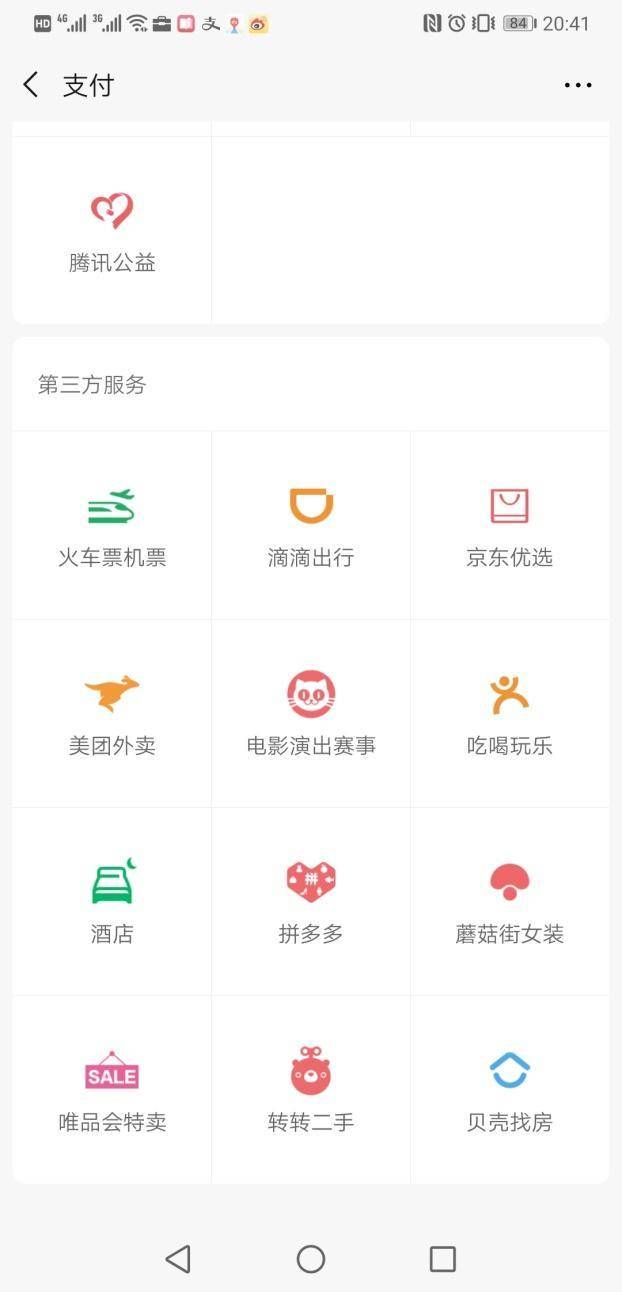 而且,你打開微信支付就能看到,在“第三方服務(wù)”的十二宮格里,同在電商領(lǐng)域爭食的,就有京東、拼多多、唯品會(huì)、蘑菇街4家。“馬爸爸”領(lǐng)養(yǎng)的孩子實(shí)在太多了,想給誰喂點(diǎn)獨(dú)食照顧一下并不容易。