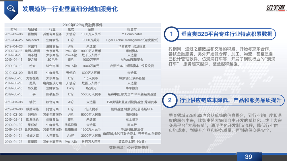 B2B電商行業(yè)自2015年迎來熱潮之后,資本逐步向頭部平臺聚攏,大平臺基于歷史數(shù)據(jù)的積累快速發(fā)展更全面的供應(yīng)鏈服務(wù)提升行業(yè)壁壘。但隨著產(chǎn)業(yè)鏈的變革,行業(yè)必然會出現(xiàn)新的機(jī)會,垂直B2B電商憑借縱深的行業(yè)積累以及專業(yè)化的增值服務(wù)將發(fā)揮其充分的價(jià)值。