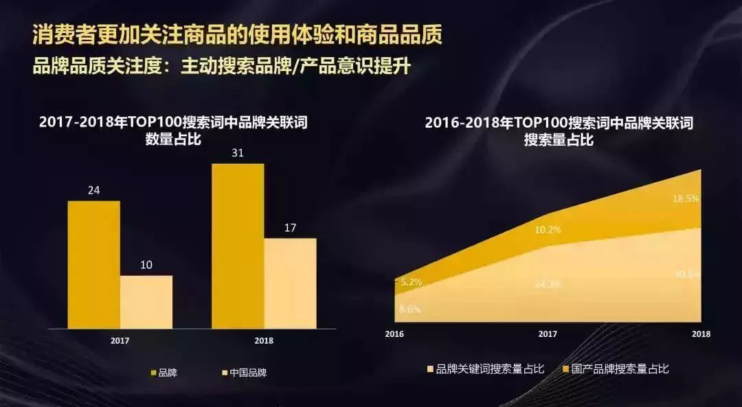 從中經(jīng)社經(jīng)濟智庫、中傳-京東大數(shù)據(jù)聯(lián)合實驗室聯(lián)合發(fā)布《2019“新國貨”消費趨勢報告》中可以看到近年人們對于品牌尤其中國品牌的關(guān)聯(lián)詞搜索占比大幅攀升,新消費力量的品牌意識已經(jīng)覺醒。