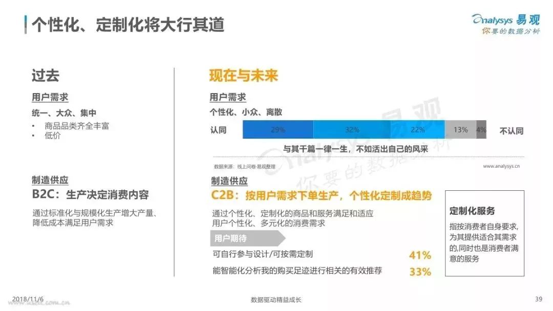 如今中國的消費市場呈現(xiàn)分級化趨勢,根據(jù)易觀發(fā)布的《新消費趨勢洞察白皮書2018》白皮書顯示,人們對個性化、定制化的需求越來越多,33%的用戶期待智能化分析購買足跡進行相關(guān)的有效推薦。