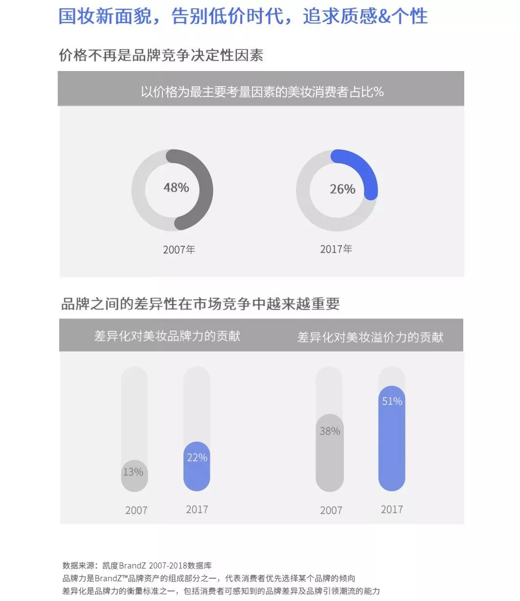 再從品牌角度來看,《騰訊國貨美妝洞察報告》顯示品牌之間的差異性將越來越重要,到17年差異化對美妝溢價力的貢獻已達到51%。