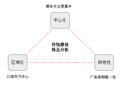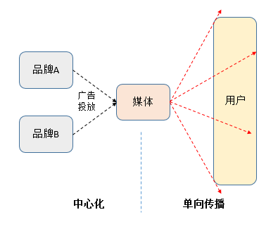 中心化:傳統(tǒng)媒體中心化明顯。供求關系決定了傳統(tǒng)媒體投放的價格不菲