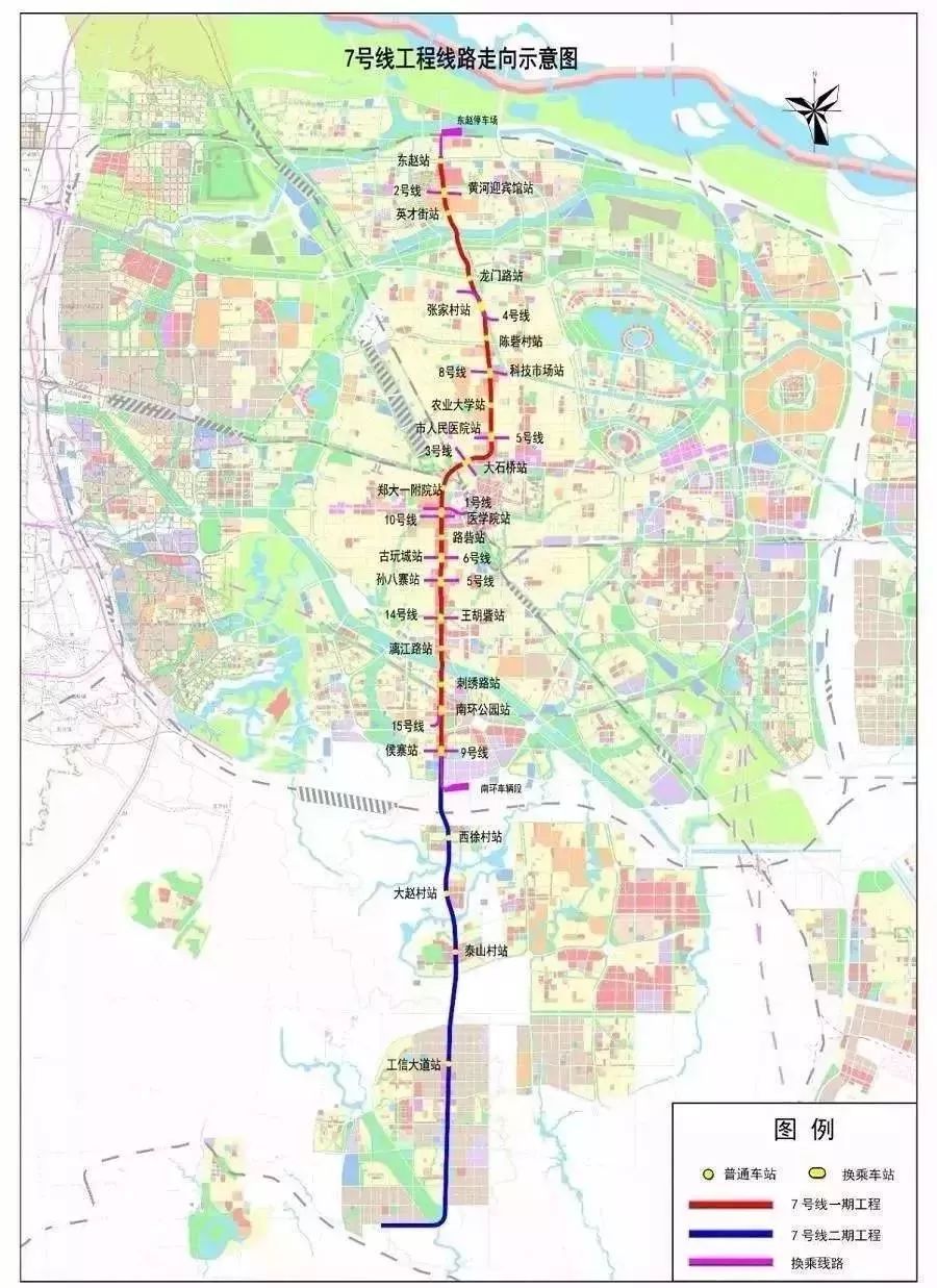 7號線一期自東趙站至侯寨站,線路長 26.9 公里,設車站20 座,從北四環(huán)沿文化路、大學路、大學南路走向。