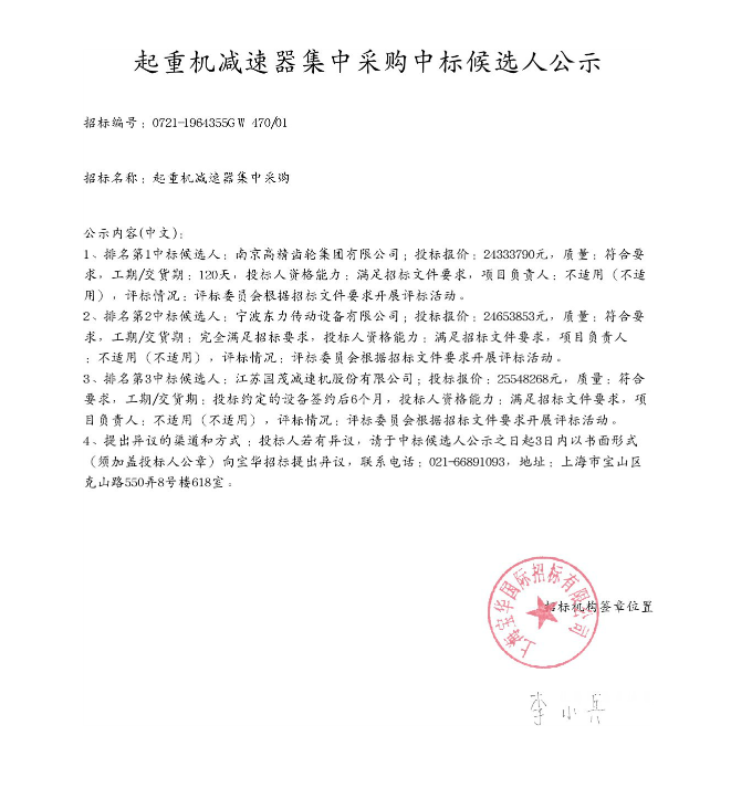 移動版:起重機(jī)減速器集中采購中標(biāo)候選人公示