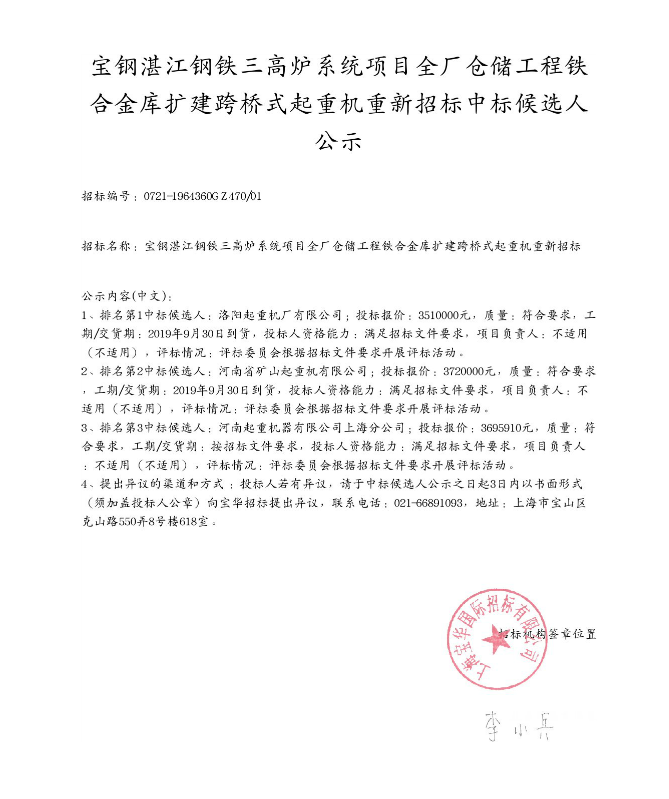 移動(dòng)版:寶鋼湛江鋼鐵三高爐系統(tǒng)項(xiàng)目全廠(chǎng)倉(cāng)儲(chǔ)工程鐵合金庫(kù)擴(kuò)建跨橋式起重機(jī)重新招標(biāo)中標(biāo)候選人公示