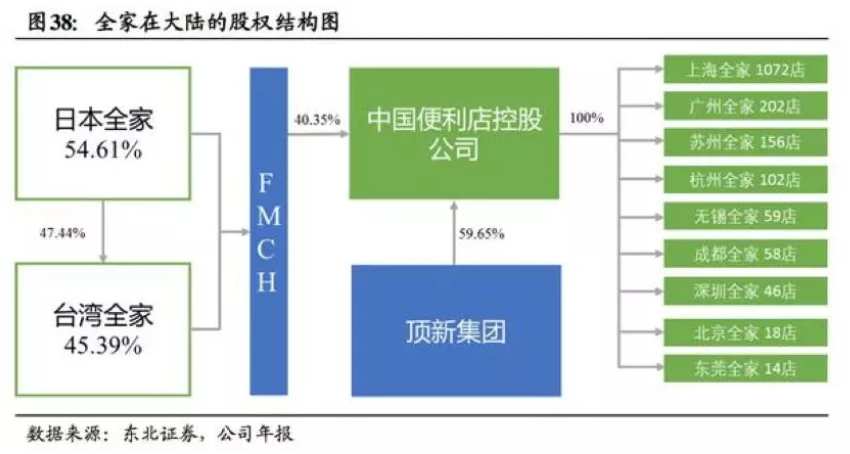 2004年,全家正式進(jìn)入國內(nèi)市場(chǎng),而背后實(shí)際控制公司則是中國便利店控股公司,其中頂新集團(tuán)占股59.65%,臺(tái)灣全家占股約18.35%,剩余股權(quán)則由日本全家、伊藤忠商事株式會(huì)社、FMCH(FamilyMart China Holding)共同持有。