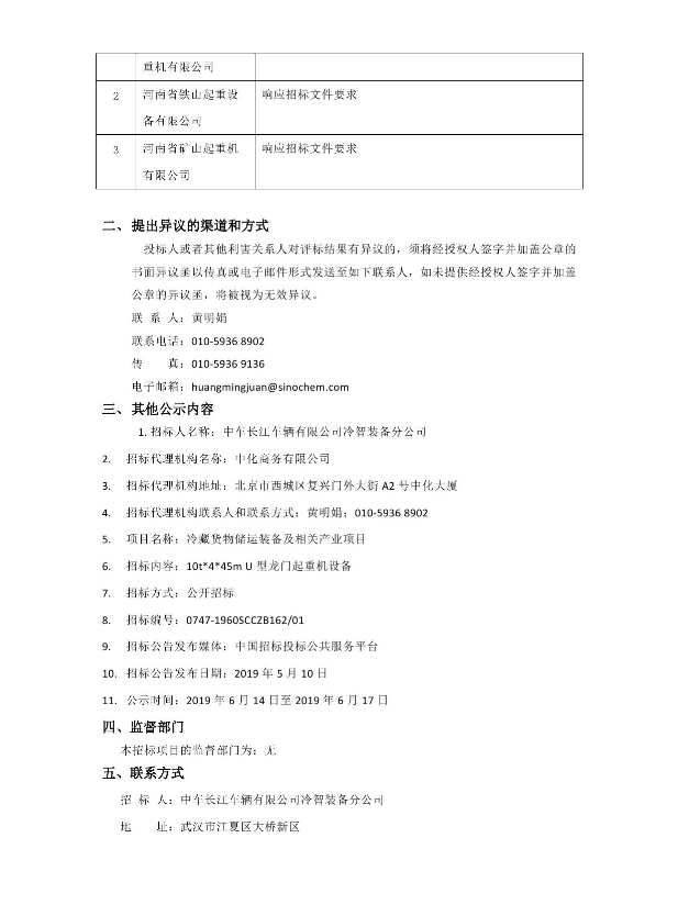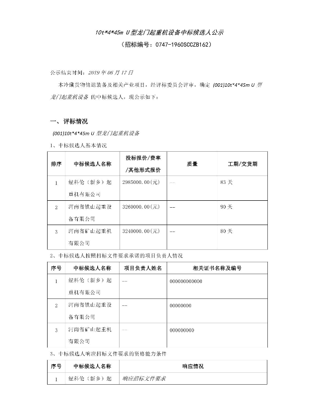 10t*4*45m U型龍門起重機設(shè)備中標候選人公示