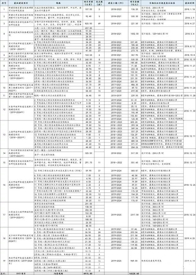小編整理出了國(guó)家發(fā)改委正式批復(fù)軌交項(xiàng)目清單(2018.1.1-2019.6.20),并對(duì)獲批項(xiàng)目的具體的線路、項(xiàng)目里程、站點(diǎn)數(shù)量、建設(shè)工期、項(xiàng)目投資金額以及車(chē)輛及運(yùn)行速度技術(shù)標(biāo)準(zhǔn)也進(jìn)行了全部統(tǒng)計(jì),信息量大,內(nèi)容重要,建議收藏!