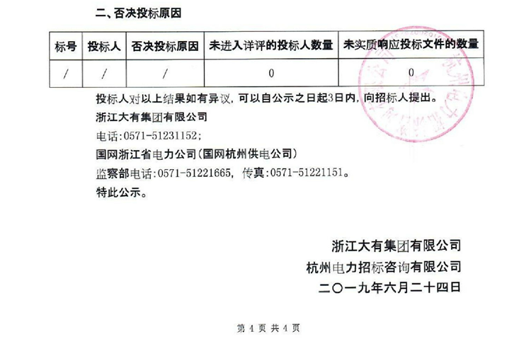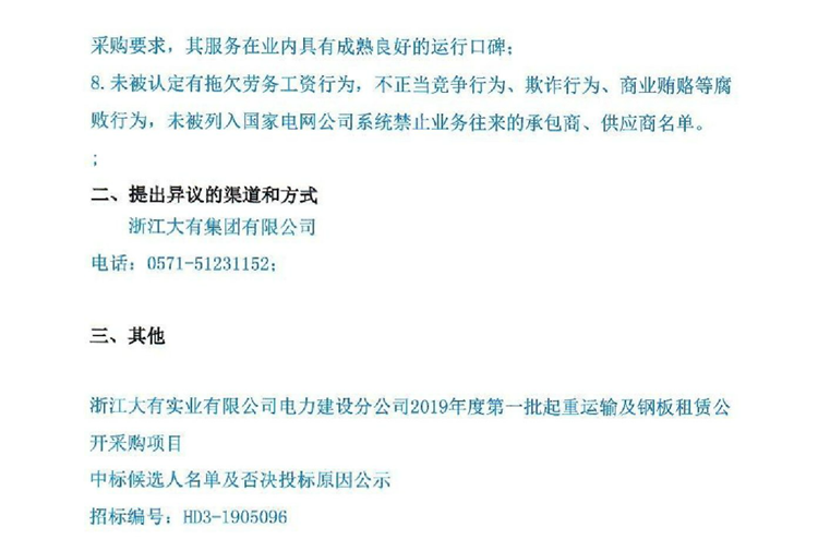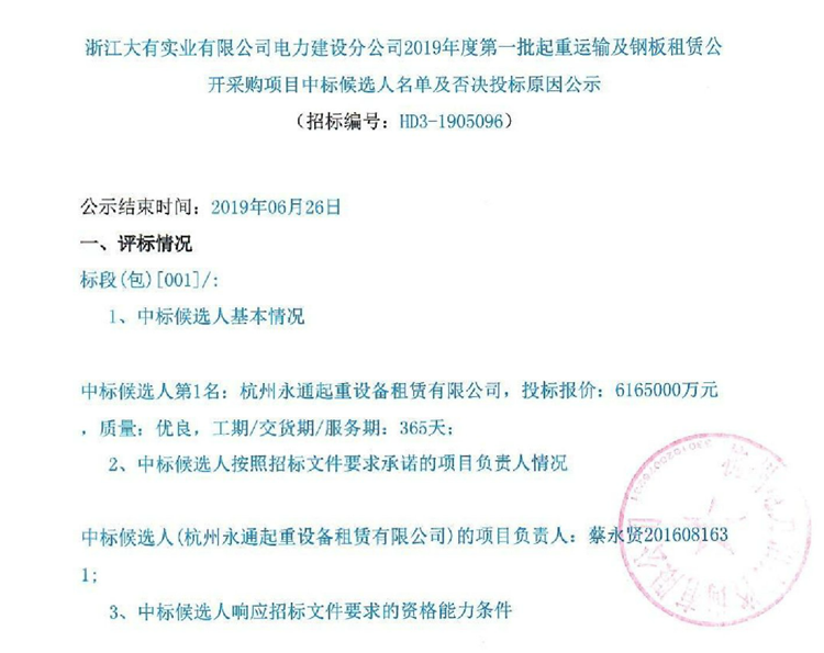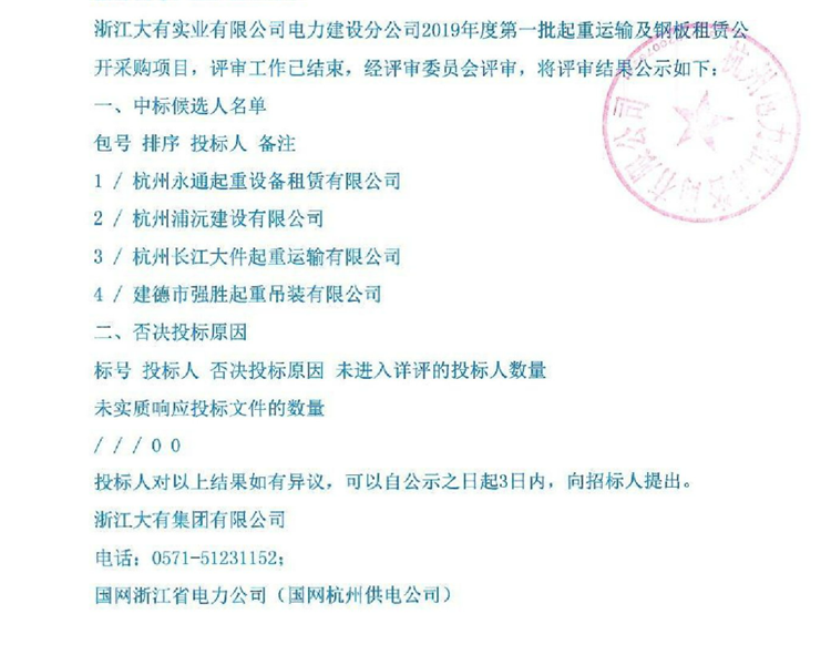 移動版:浙江大有實業(yè)有限公司電力建設(shè)分公司2019年度第一批起重運輸及鋼板租賃公開采購項目中標(biāo)候選人名單及否決投標(biāo)原因公示
