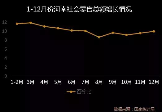 在消費(fèi)品零售領(lǐng)域,2018年河南社會消費(fèi)品零售總額20594.74億元,同比增長10.3%。城鎮(zhèn)消費(fèi)品零售額5249.96億元,同比增長8.0%;鄉(xiāng)村消費(fèi)品零售額442.82億元,增長7.1%,商品零售5262.61億元,增長7.8%。