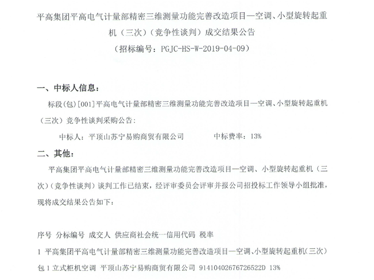 移動版:平高集團平高電氣計量部精密三維測量功能完善改造項目—空調(diào)、小型旋轉(zhuǎn)起重機(三次)(競爭性談判)成交結(jié)果公告