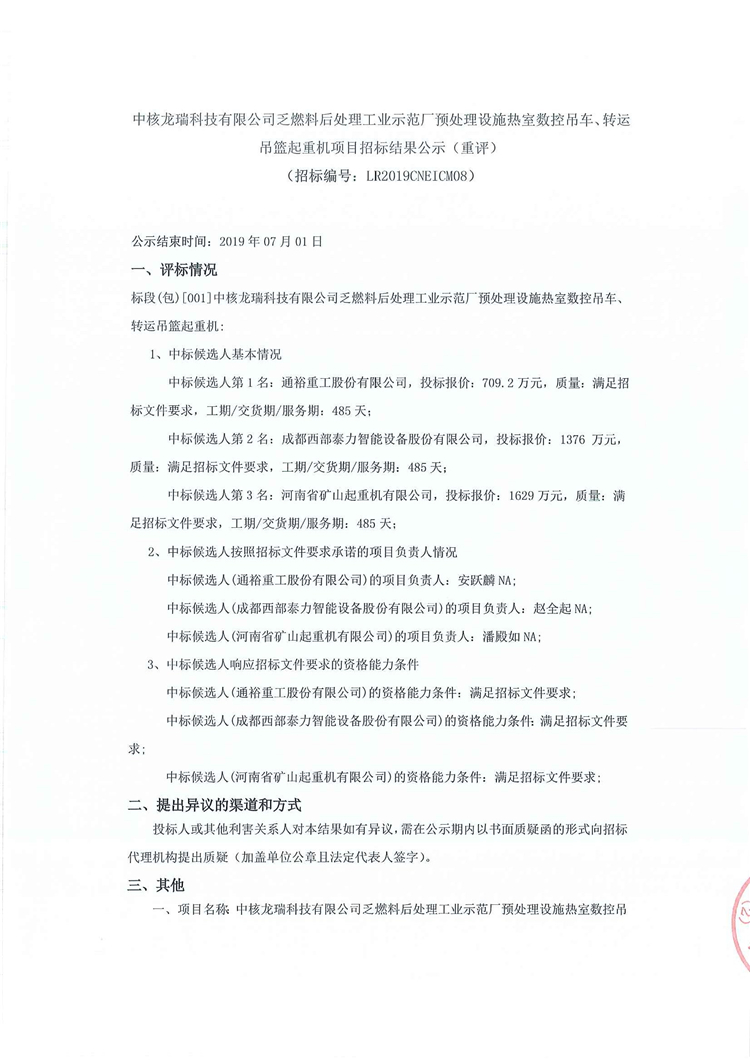 移動(dòng)版:中核龍瑞科技有限公司乏燃料后處理工業(yè)示范廠(chǎng)預(yù)處理設(shè)施熱室數(shù)控吊車(chē)、轉(zhuǎn)運(yùn)吊籃起重機(jī)項(xiàng)目招標(biāo)結(jié)果公示(重評(píng))