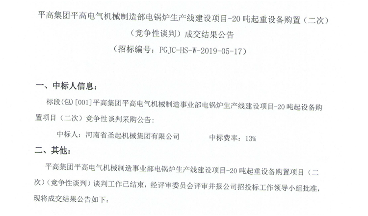 平高集團(tuán)平高電氣機(jī)械制造部電鍋爐生產(chǎn)線建設(shè)項(xiàng)目-20噸起重設(shè)備購(gòu)置(二次)(競(jìng)爭(zhēng)性談判)成交結(jié)果公告
