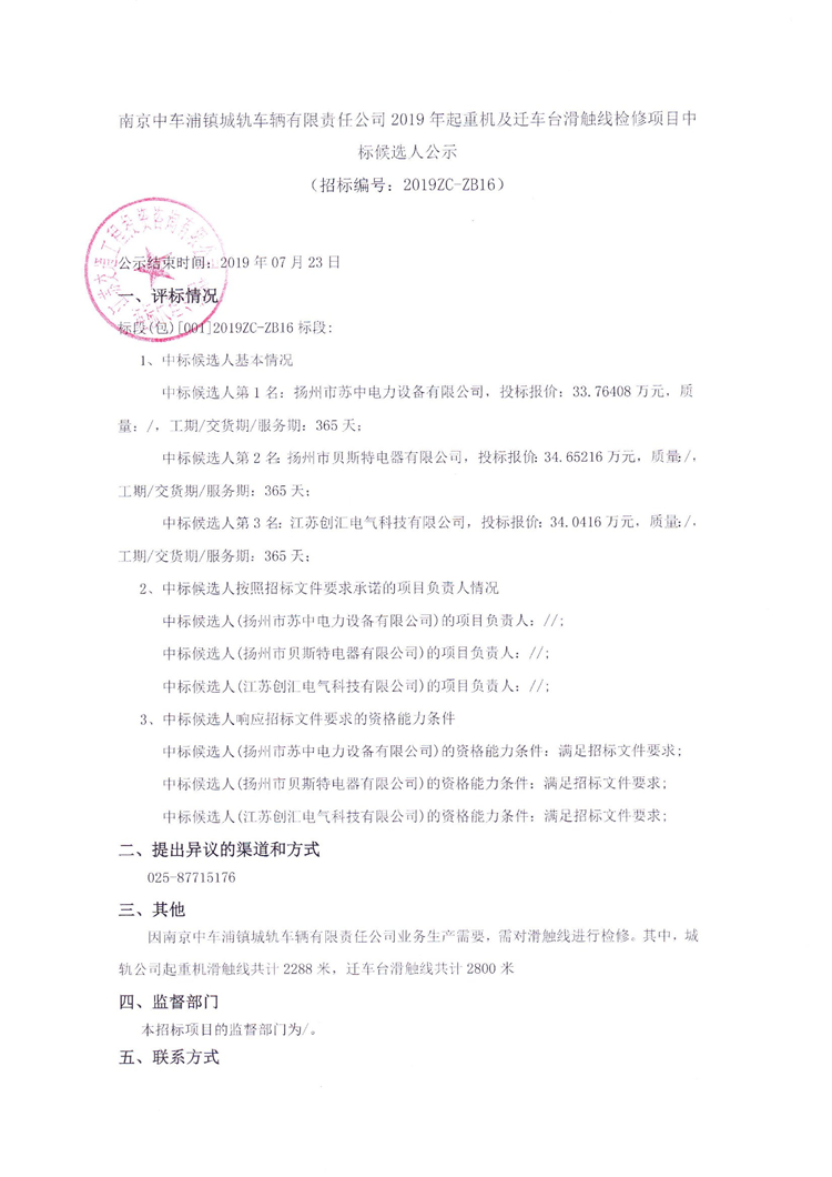 移動(dòng)版:南京中車浦鎮(zhèn)城軌車輛有限責(zé)任公司2019年起重機(jī)及遷車臺(tái)滑觸線檢修項(xiàng)目中標(biāo)候選人公示