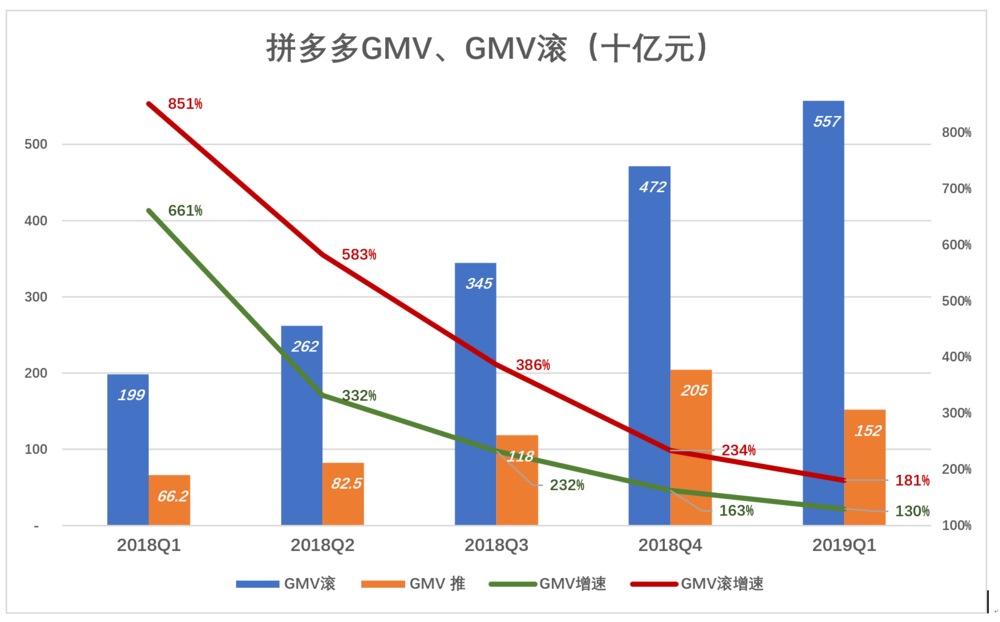 由于基數(shù)小,拼多多GMV增速很高,但回落很快。2018年Q1,GMV為662億,同比增長(zhǎng)661%;2018年Q4,GMV達(dá)2050億,同比增速降至163%。