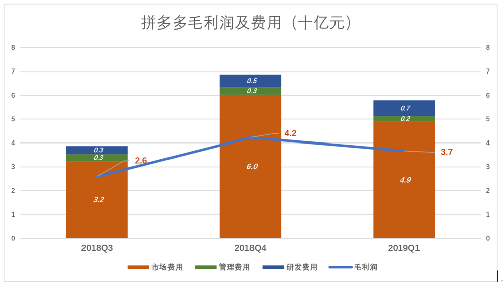 2019年Q1毛利潤(rùn)37億,而市場(chǎng)、管理、研發(fā)三項(xiàng)費(fèi)用合計(jì)57.9億,其中僅市場(chǎng)費(fèi)用就將近49億。