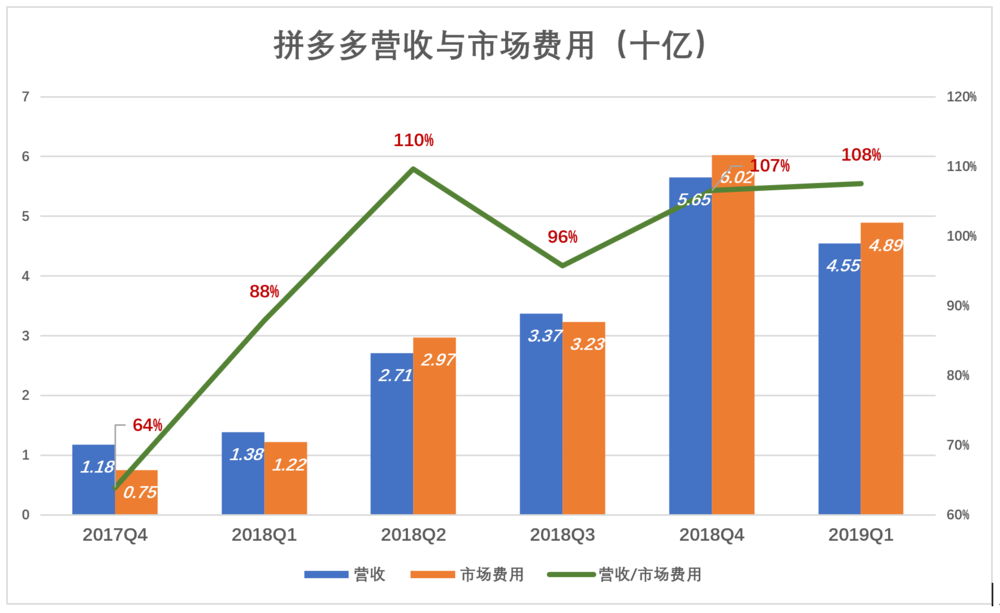 2018年Q1,12.2億市場(chǎng)費(fèi)用換來(lái)13.5億營(yíng)收增長(zhǎng),1塊換1塊1,效率遠(yuǎn)遜于秦池;2018年Q2,29.7億市場(chǎng)費(fèi)用只換來(lái)26億營(yíng)收增長(zhǎng),1塊換8毛8;2019年Q1,48.9億市場(chǎng)費(fèi)用只換來(lái)31.6億億營(yíng)收增長(zhǎng),1塊市場(chǎng)費(fèi)用換來(lái)6毛5營(yíng)收增長(zhǎng)。#阿基米德要用石頭撬動(dòng)地球,拼多多卻是用地球撬動(dòng)石頭#