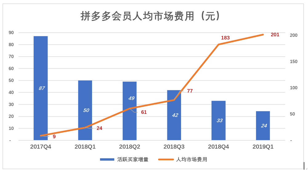 2019年Q1,拼多多活躍用戶4.43億,較2018年Q4凈增2430萬(wàn)。假設(shè)48.9億市場(chǎng)費(fèi)用全部用于“拉錢”,平均每位新增用戶的成本201元,而2018年Q1僅為24元,短短一年就上升了將近兩個(gè)數(shù)量級(jí)???