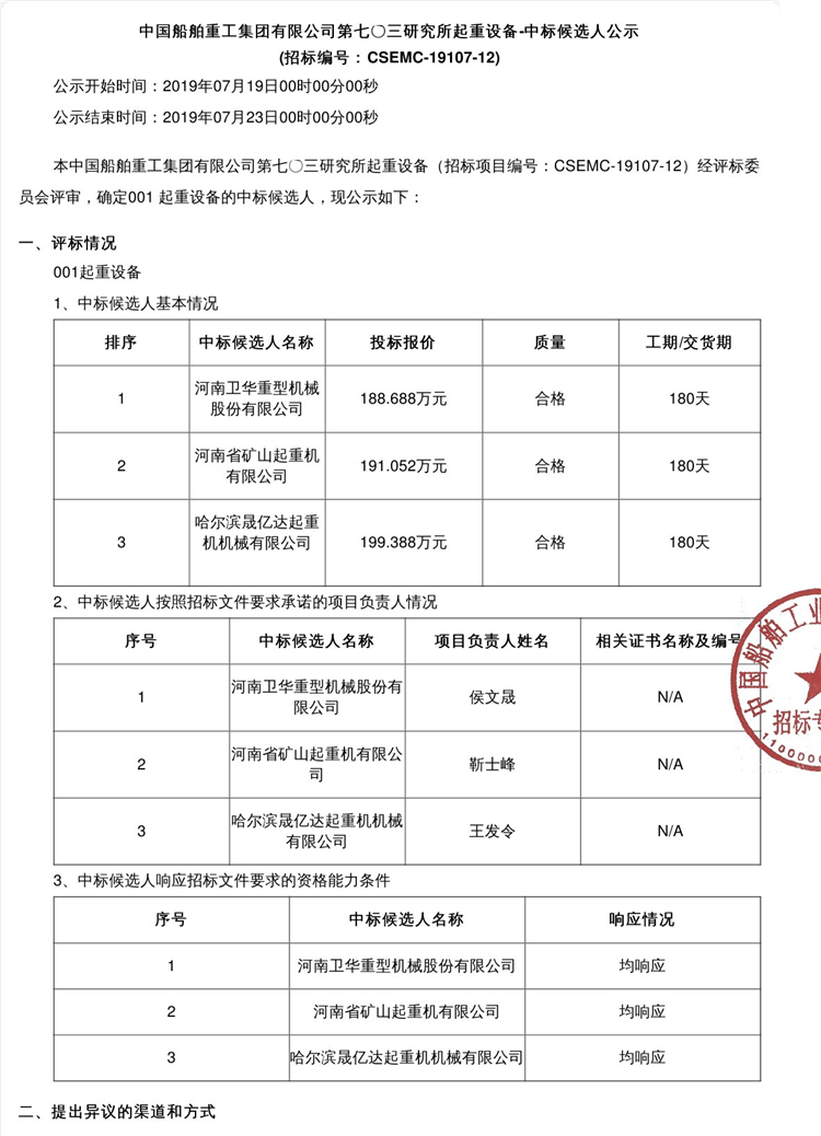 移動(dòng)版:中國船舶重工集團(tuán)有限公司第七〇三研究所起重設(shè)備-中標(biāo)候選人公示