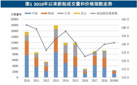 2019年上半年,全球新船市場成交量大幅萎縮至2493萬載重噸(DWT),同比減少53.6%。但新船價格基本平穩(wěn),2019年6月的克拉克松新造船價格指數(shù)為131點,較年初上漲1點。從主要造船國家看,中國、韓國和日本船企的接單量分別為1372萬DWT、772萬DWT和316萬DWT(日本船企數(shù)據(jù)為不完全統(tǒng)計),全球份額分別為55%、31%和13%。