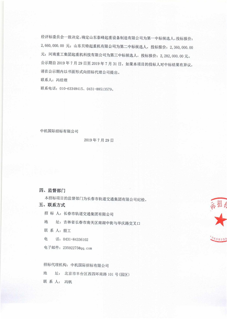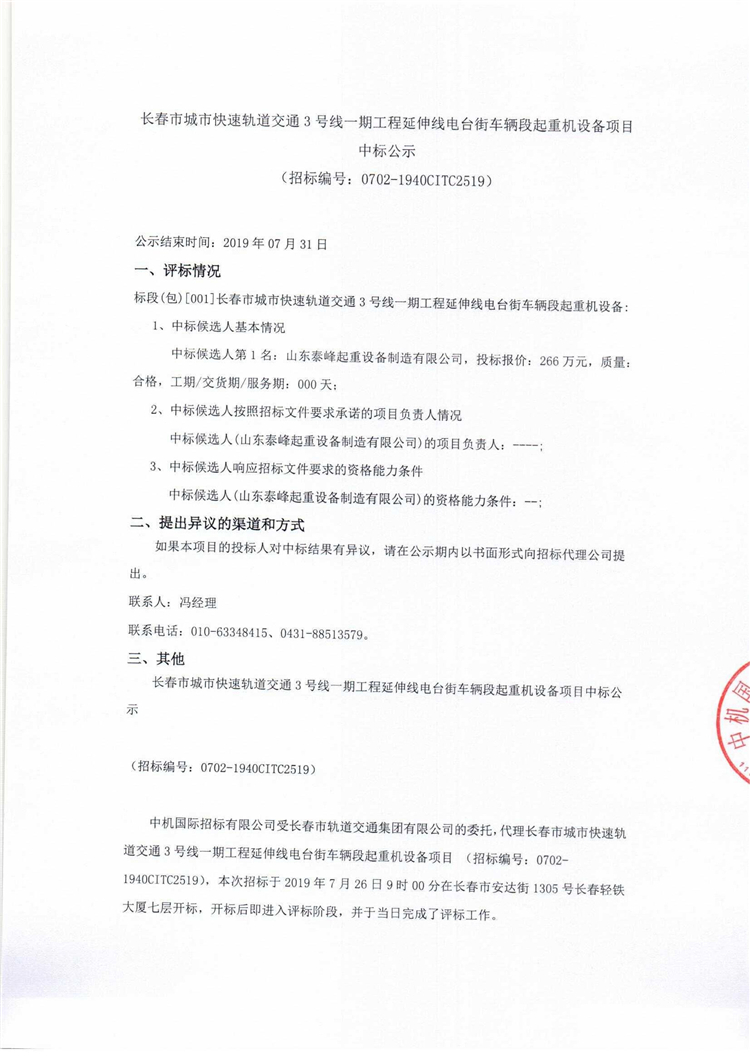 長(zhǎng)春市城市快速軌道交通3號(hào)線一期工程延伸線電臺(tái)街車輛段起重機(jī)設(shè)備項(xiàng)目中標(biāo)公示