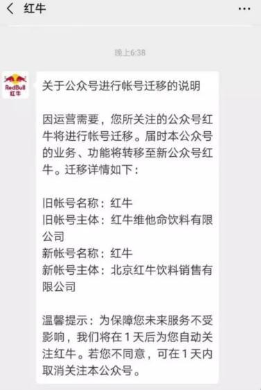 在5月13日晚上,紅牛維他命飲料有限公司官方公眾號開始遷移,公眾號主體變更為北京紅牛飲料銷售有限公司。