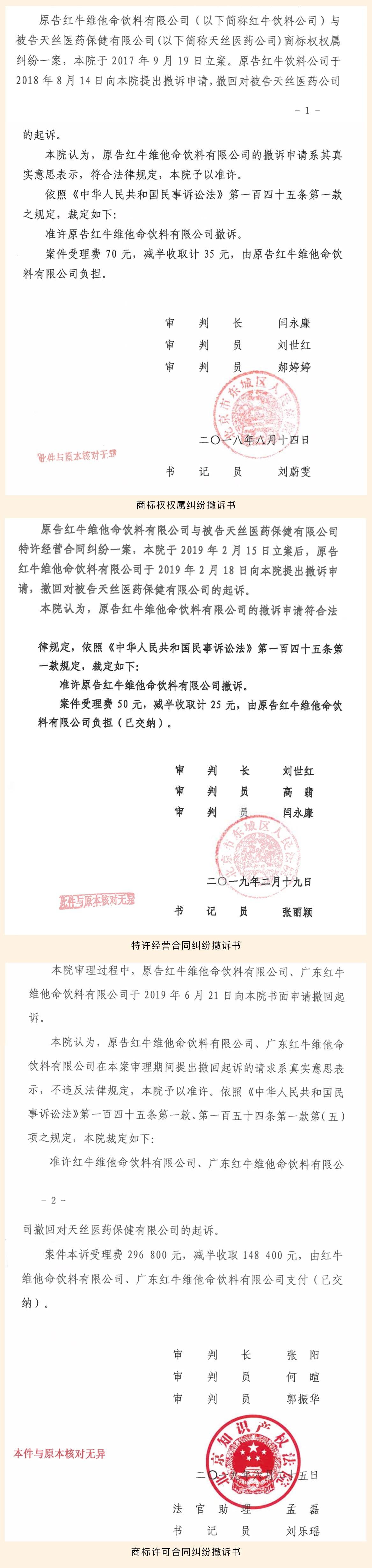2017 年 9 月在北京市東城區(qū)人民法院立案的商標權權屬糾紛于2018年8月14日撤訴;2018年9月在北京市東城區(qū)人民法院提出特許經(jīng)營合同糾紛試圖阻止紅牛安奈吉的上市,該案于2019年2月19日再次撤訴。2016年10月天絲醫(yī)藥對紅牛維他命飲料有限公司的商標許可協(xié)議到期,且未續(xù)約。紅牛維他命飲料有限公司聯(lián)合廣東紅牛向泰國天絲提起商標許可合同糾紛,要求天絲繼續(xù)提供商標授權和香精、檸檬黃、胭脂紅等原料供應,然而該案于2019年6月公開審理前又一次撤訴。泰國天絲也正是在這次訴訟前停止了對華彬紅牛香精香料等原料的供應,于是此后業(yè)內(nèi)人士發(fā)現(xiàn)紅牛口味變淡。