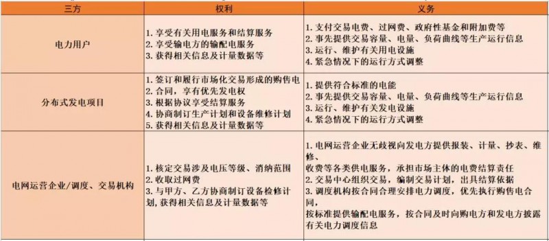 此外,三方協(xié)議及交易平臺(tái)同樣是分布式發(fā)電市場(chǎng)化交易中的要點(diǎn)。三方協(xié)議需購(gòu)電方(電力用戶(hù))、發(fā)電方(分布式發(fā)電項(xiàng)目)、輸電方(電網(wǎng)運(yùn)營(yíng)企業(yè))共同明確易模式、交易電量、交易期限,交易價(jià)格、計(jì)量、結(jié)算,以及三方權(quán)利與義務(wù)等內(nèi)容。三方具體權(quán)利及義務(wù)如下表所示: