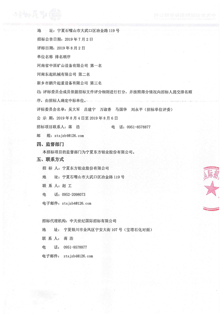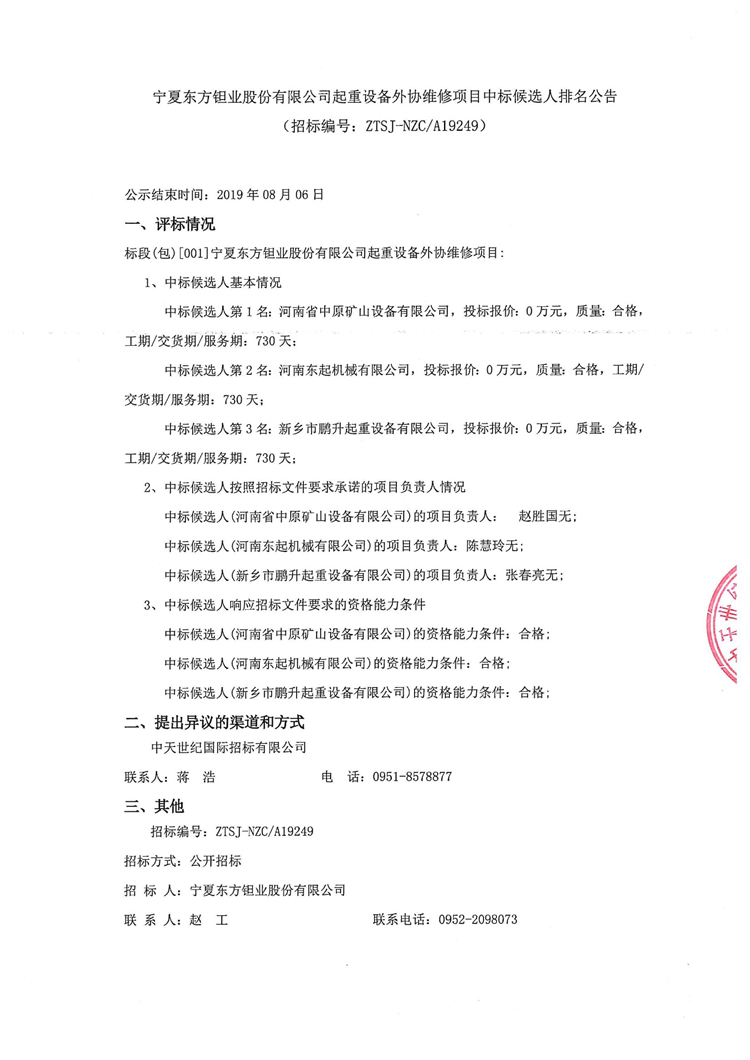 寧夏東方鉭業(yè)股份有限公司起重設(shè)備外協(xié)維修項(xiàng)目中標(biāo)候選人排名公告
