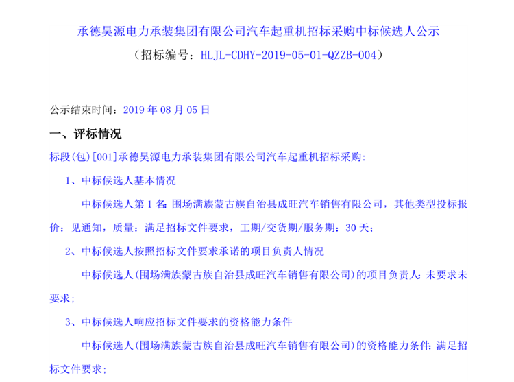 移動(dòng)版:承德昊源電力承裝集團(tuán)有限公司汽車起重機(jī)招標(biāo)采購(gòu)中標(biāo)候選人公示