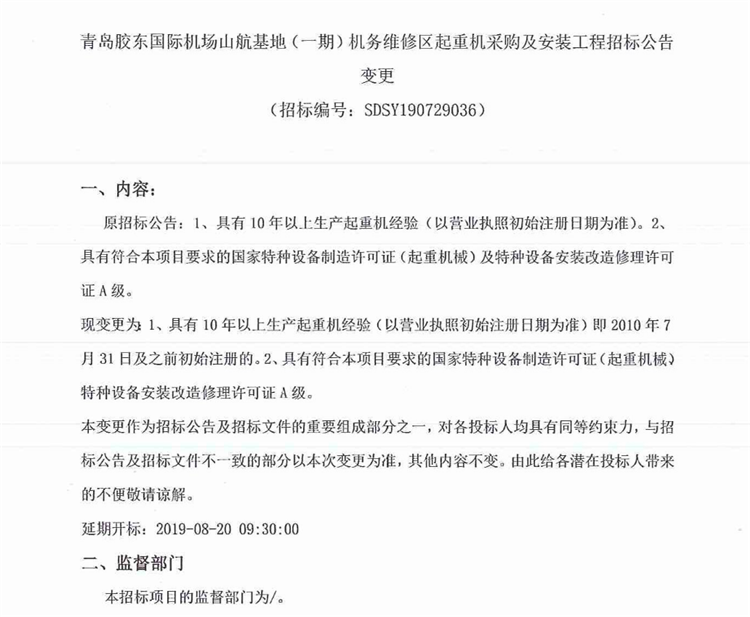 移動版:青島膠東國際機場山航基地(一期)機務維修區(qū)起重機采購及安裝工程招標公告變更