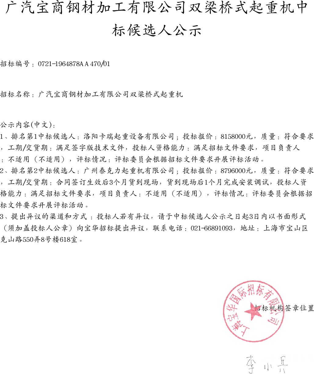 移動版:廣汽寶商鋼材加工有限公司雙梁橋式起重機中標(biāo)候選人公示