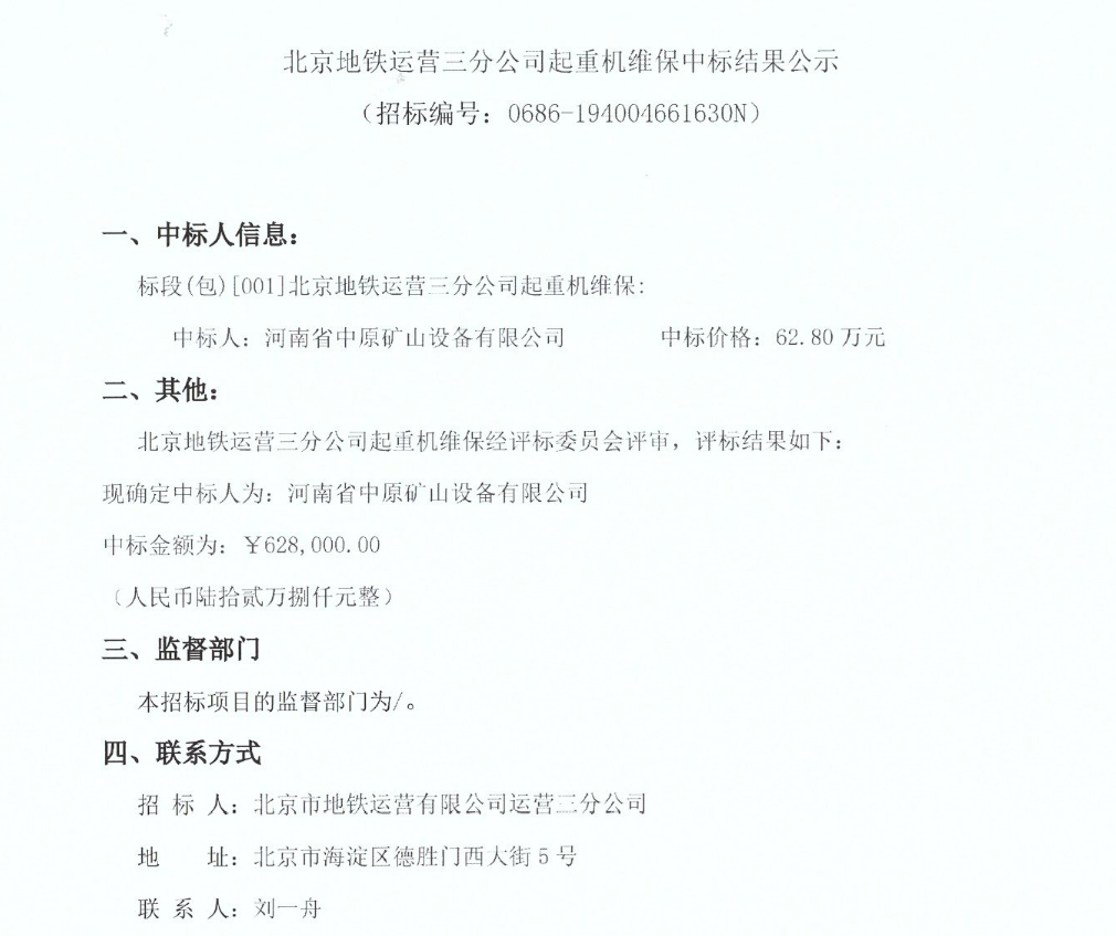 北京地鐵運營三分公司起重機維保中標結(jié)果公示