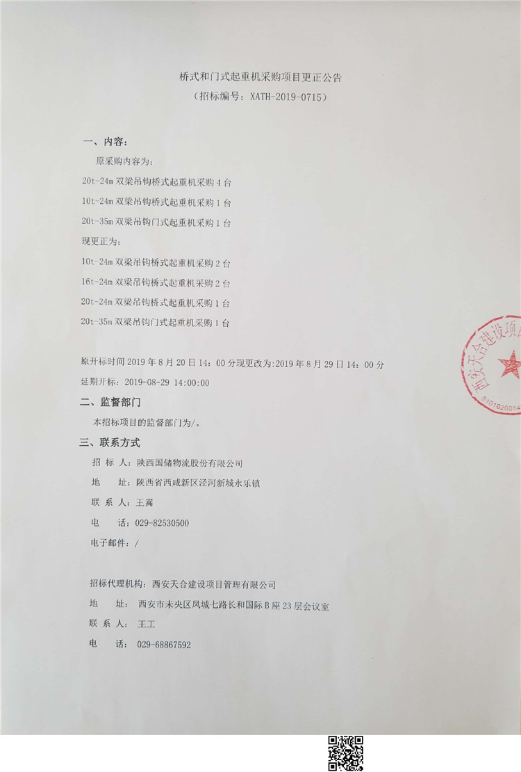 移動版:橋式和門式起重機采購項目更正公告