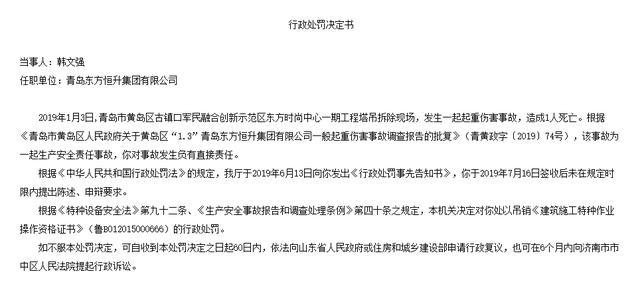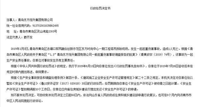 其中,魯建罰字〔2019〕35號行政處罰決定書當事人青島東方恒升集團有限公司,行政處罰決定書顯示:2019年1月3日,青島市古鎮(zhèn)口軍民融合創(chuàng)新示范區(qū)東方時尚中心一期工程塔吊拆除現(xiàn)場,發(fā)生一起起重傷害事故,造成1人死亡。根據(jù)《青島市黃島區(qū)人民政府關(guān)于黃島區(qū)“1.3”青島東方恒升集團有限公司一般起重傷害事故調(diào)查報告的批復(fù)》(青黃政字〔2019〕74號),該事故為一起生產(chǎn)安全責任事故,青島東方恒升集團有限公司對事故發(fā)生負有主要責任。