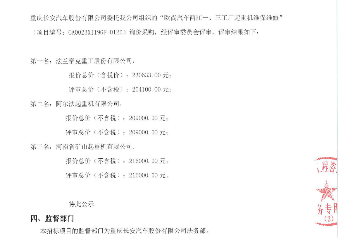 移動版:歐尚汽車兩江一、三工廠起重機維保維修中選候選人公示