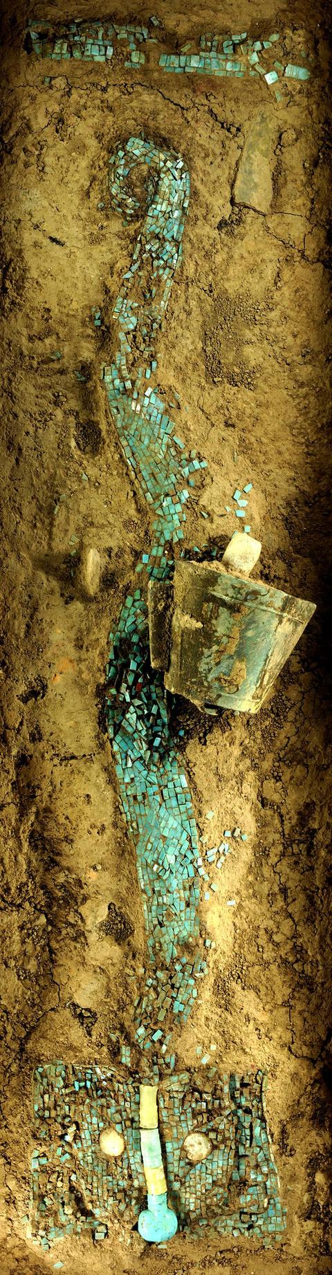 綠松石龍形器,由2000余片綠松石組成,巨頭蜷尾,龍身曲伏有致,其制作之精、體量很大。