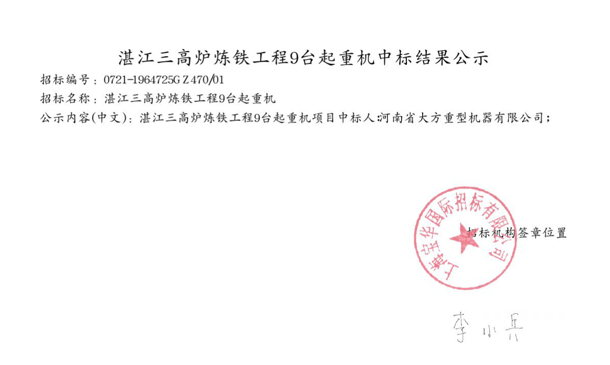 湛江三高爐煉鐵工程9臺起重機中標(biāo)結(jié)果公示