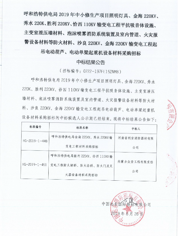 【呼和浩特供電局2019年中小修生產(chǎn)項目照明燈具、金海220KV、秀水220K、勝利220KV、恰西110KV輸變電工程平抗吸音體設施、主變室泄壓墻材料、泡沫噴霧消防系統(tǒng)裝置及室內管道、火災報警設備材料等防火材料、沙良220KV、金海220KV輸變電工程起吊電動葫蘆、電動單梁起重機設備材料采購招標】中標結果公告
