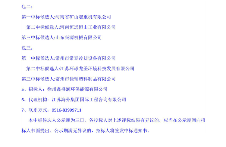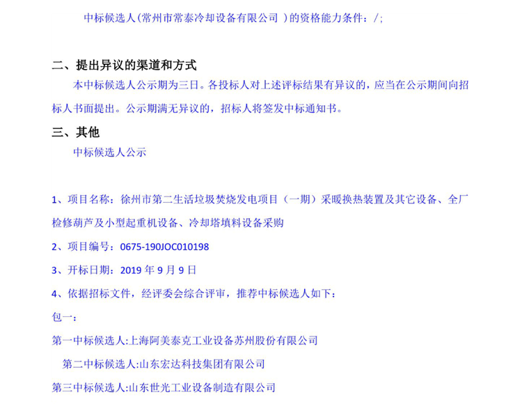 移動版:徐州市第二生活垃圾焚燒發(fā)電項目(一期)采暖換熱裝置及其它設備、全廠檢修葫蘆及小型起重機設備、冷卻塔填料設備采購中標候選人公示