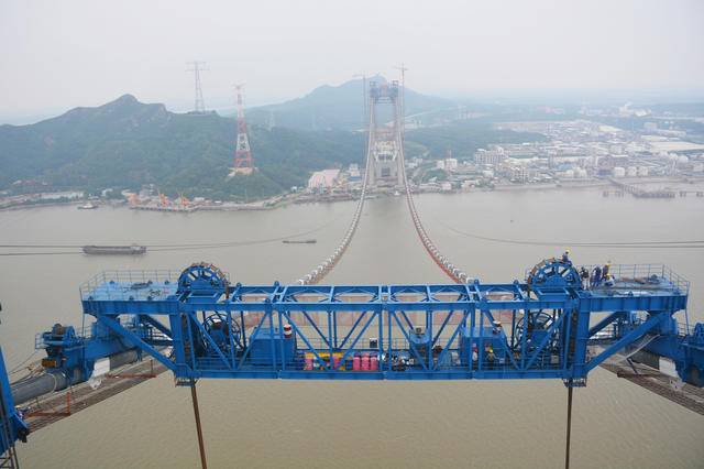 連鎮(zhèn)鐵路鎮(zhèn)江五峰山項目部二分部工程部部長王瑞告訴記者:“在起吊纜載吊機之前,先由測量組人員在大橋主纜上計算定位點,通過15T卷揚機和80T四門滑車組構成的塔頂門架吊裝系統(tǒng),進行提升安裝。既要左右保持平衡,又要克服天氣影響,最終與兩側走行裝置上的八個銷軸孔精準對接,將誤差控制在1公分之內”。