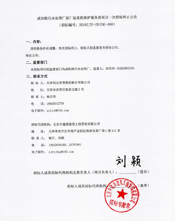咸陽(yáng)路污水處理廠新廠起重機(jī)維護(hù)服務(wù)商項(xiàng)目一次招標(biāo)終止
