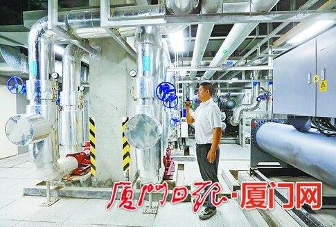 工作人員檢查冷水機房。