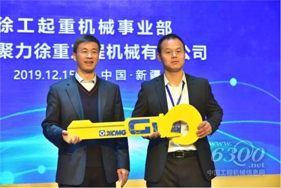 徐工起重機(jī)事業(yè)部總經(jīng)理助理、營銷公司總經(jīng)理王萬才將QAY650A金鑰匙交付至新疆萬新吊裝公司