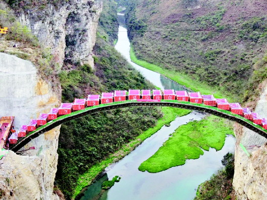 施工中的西溪河拱橋正進(jìn)行荷載試驗(yàn)。